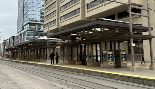 East Bank station is a light rail station along the Green Line in Minneapolis, Minnesota, located on Washington Avenue on the East Bank campus of the University of Minnesota. It is located between Union Street and Harvard Street. This is south of the Transportation and Safety Building and north of Moos Tower and Weaver-Densford Hall.[2]