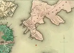 As early as 1801, William H. Sumner, who had inherited a large tract on Noddle's Island, proposed that the federal government of the United States create a turnpike to connect Massachusett's North Shore (along with Sumner's property on Noddle's) to Boston, arguing that such a road would create a valuable, direct route across Boston's harbor, making it easier for Boston, at the time an isolated peninsula surrounded by water, to expand: "There is no doubt but that the necessities of the town of Boston will some time require a connection with Noddle's Island."[8] When this plan was rejected in favor of a route through Chelsea (a route, not coincidentally, that left the Boston navy yard in nearby Charlestown with ocean access), Sumner moved onto other plans to improve Noddle's value.