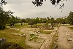 Before excavation of the East Buildings, Wilhelm Dörpfeld suggested that the area was the site of the Gymnasium of Ptolemy, which the second-century AD writer Pausanias states was "near the Agora". Homer Thompson and John Travlos revived this idea in 1966.[12][13] Thompson proposed that the marble bedding blocks supported "tables or chests, to hold books and visual aids needed for class recitations," comparing similar blocks found in the Academy. He identified the two southern rooms on the western side as a classroom and a washroom respectively.[14] This interpretation required the square building at the west end of the South Square to be the Temple of Theseus, but subsequent discoveries showed it to be the Aiakeion.[15] Most scholars now place the Ptolemaion somewhere to the east of the Agora.[16]