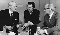 From July 30 to August 1, 1975, U.S. President Gerald Ford met with Erich Honecker and had a brief conversation during the Helsinki summit which led to the passing of the Helsinki Accords. This marked the first time leaders of both countries met and spoke to each other.[5]