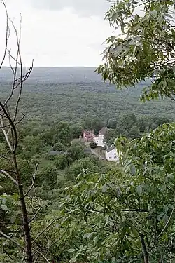 East Granby is in the Farmington valley, with the Farmington River passing along the southern border of the town. The Metacomet Ridge, a mountainous trap rock ridgeline that stretches from Long Island Sound to nearly the Vermont border, runs through the center of the town, cutting off Salisbury Plain to the east, which used to lie under the ancient, glacial Lake Hitchcock. High points on the Metacomet Ridge in East Granby include Hatchet Hill and Peak Mountain; the latter offers a bird's eye view of the historic Old Newgate Prison. The 51-mile (82 km) Metacomet Trail traverses the ridge.