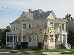 • The Rinde house at 201 S. Franklin Street is a 2-story frame Queen Anne-styled house built in 1904. Typical of the style, it is asymmetric with wood shingles cut to give a different texture in the gables, and has a complex roof. The 2-story corner front porch is rather unusual. Lewis Rinde dealt in real estate.[3][5]
