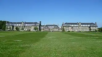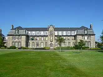 The architect selected was Alan Keith Robertson (1881–1925), architect to the Scottish Education Department. Thomas Swann, (1883–1925), Robertson's partner in the firm, had previously worked with Sir Robert Lorimer and the new halls of residence were designed in the Arts and Crafts style popularised by Lorimer. The three halls had mansard roofs and were grouped around a large grassed quadrangle, similar to the design of campus buildings at McGill University, Montreal designed by another Scottish Lorimer trainee, Percy Erskine Nobbs.[4] The design was 3-storey, symmetrical, 15-bay U-plan block. with the first and second storeys recessed.[5] The front and side elevations were constructed from stone from Craigleith Quarry and the rear elevations finished in brickwork and harling.[3]