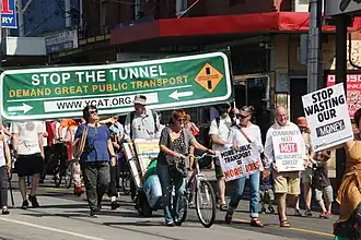 The East West Link project attracted criticism from the local councils of Melbourne,[94] Moreland, Yarra[95] and Boroondara, the Public Transport Users Association, Geelong politicians and others, with complaints that it was a misuse of public funds, would fail to alleviate Hoddle Street congestion and would lead to permanent loss of parts of Royal Park.[96] Critics claimed the need for the project was not supported by traffic statistics and that the State Government should instead have used funds for the Melbourne Metro Rail Project. The decision to start work first on the eastern end of the project was also criticised, with claims that the project's greatest need was to provide an alternative river crossing to the West Gate Bridge. Yarra City Council launched a "Trains Not Toll Roads" campaign in June 2013, to which it committed $200,000 from its 2013/14 Budget. It also spent $405,000 on legal representation at the Government's 30-day East West assessment committee hearings. A meeting to launch the campaign attracted 400 people and the council said it would look at all options, including legal challenges, to stop the tunnel. An online petition against the link attracted more than 1300 names.[97][98]