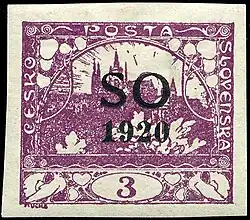 Overprint on imperforate Hradcany 3-haleru stamp of Czechoslovakia.