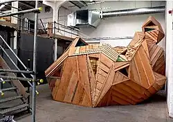 Eastside Projects' organisational model promotes the intertwining of exhibition space and programme. Making the gallery an artwork within itself. There are a number of long-term works located within the gallery, which formed elements of previous exhibitions. "Local Myths", a totemic sculpture by Jennifer Tee has been a permanent fixture in the gallery since 2010. The handle of the front door is a work entitled "Wilkommen. Bienvenue. Welcome. C'mon in." by Artist Matthew Harrison. The old office was a structure, "Pleasure Island", originally designed by Heather and Ivan Morison for the Welsh Pavilion at the Venice Biennale in 2007.[4] [1]