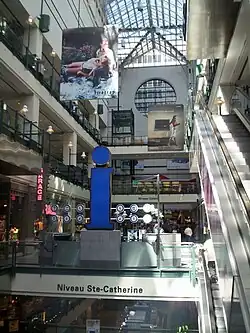 - Montreal Eaton Centre, Montreal, Quebec: Opened in 1990 on Sainte-Catherine Street, it is Downtown Montreal's largest shopping mall. It is situated next to Eaton's former Montreal flagship store. When Eaton's closed in 1999, the former flagship location was renovated and reopened in 2002 as the Complexe Les Ailes mall (after the new anchor tenant Les Ailes de la Mode). In March 2014, mall owner Ivanhoe Cambridge announced that it would merge the Montreal Eaton Centre with the neighbouring Complexe Les Ailes and, contrary to a previously made statement, decided to preserve the "Montreal Eaton Centre" name.[2] The merger and renovation, which was completed in 2020, restored the Eaton name to the former flagship store building.[3]