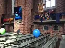 Image from Klosters church in Eskilstuna during Springpride 2016, shows two works from the Ecce Homo exhibition.