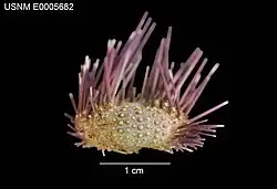 The test measures from 2 to 4 centimetres (0.79 to 1.57 in) in diameter, and the color of the spines is very variable: they are often brown-purple, but can be shades of purple, brown, black, grey or off-white. Those on the oral face can also have a cream color with brown-purple rings, although they are rarely visible. The test ranges from black to light brown, with the bottom of the spines showing often highly contrasting rings. The apical disk is dark and lacking spines, forming a highly visible disk at the apex of the test.[2]