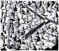 Samuel de Champlain's sketch of a Huron deer hunt; Huron men make noise and drive animals along a V-shaped fence towards an apex where they are captured and killed.