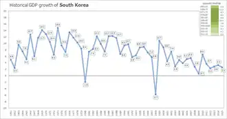 After the bounce back from the 1997 Asian financial crisis, the economy continued strong growth in 2000 with a GDP growth of 9.08%.[56] However, the South Korean economy was affected by the September 11 attacks. The slowing global economy, falling exports, and the perception that corporate and financial reforms had stalled caused growth to decrease to 3.8% in 2001[58] Thanks to industrialisation GDP per hour worked (labour output) more than tripled from US$2.80 in 1963 to US$10.00 in 1989.[58] More recently the economy stabilised and maintained a growth rate of between 4–5% from 2003 onwards.[58]