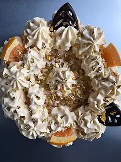 Edible gold can be used in mainly three different shapes to garnish foods and beverages: leaf-shaped, in flakes or in powder. Among the dishes and beverages in which edible gold is implemented there are cakes and sweet desserts, soups, pastas, risottos, sushi, cocktails and wines. Since it is used as tasteless garnish, edible gold is usually the ingredient at the top of the dish at direct contact with food. In most of the recipes requiring gold in flakes or dust, it is usually dabbed with a knife or sprinkled on the top. Gold is added during the bottling of wines and liqueurs and it is generally mixed during cocktails' preparation.[8] More recently, gold leaves have been used to garnish steak and hamburgers: Hard Rock Café's "24-Karat Gold Leaf Steak Burger" was sold in USA for $7 extra than the one without the metallic garnish.[9] Salt Bae, the chef owner of the Nusr-Et restaurants chain, includes in his menu a steak entirely covered by gold, sold at €650 in Greece.[10][11]