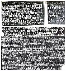 Edilpur Copperplate (Bengali: ইদিলপুর তাম্রলিপি) was found in a char land dug of Edilpur zamindari under Shariatpur District of Bangladesh about 120 miles directly east of Calcutta. Baboo Conoylal Tagore of Tagore zamindari has presented the plate to Asiatic Society of Bengal in 1838, but now it is missing from collection. The plate is made of copper and was sharp in the letters, that the plate could have been long buried in the place where it was found. There was a seal, which is an elaborately executed figure of Siva in copper cast.[1] The character of this inscription is rather less simple than the earlier alphabets of Pala dynasty. It is strictly the Gaur character which has descended the modern written Bengali. It is much to be regretted that when the first font of Bengali type was prepared, the letters were made after the model of the running hand or written instead of this which may be called the print hand.