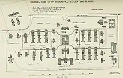 The hospital was on a greenfield site at Colinton on the southern outskirts of the city. It was built close to the Edinburgh City (Craiglockhart) Poorhouse, (which later became Greenlea Old People's Home,[3] and was redeveloped in the 1980s as residential housing known as The Steils.)[4] The Third City Hospital, now known as the Colinton Mains Fever Hospital, was designed by the Edinburgh City architect Robert Morham, who had toured European fever hospitals to incorporate their best features into his design. In Berlin he was told by Robert Koch that "sunlight is the great germicide", and this advice was followed.[5] The hospital was built in red sandstone and consisted of fifteen two-storey Nightingale pavilions separated by grassy airing grounds to ensure spacing between wards and give them greater exposure to light. All included balconies and sun rooms. There were separate blocks for patients with individual diseases together with isolation cottages. In addition there was a nurses' home, accommodation for doctors, a central administrative block and a bacteriology laboratory. The hospital was surrounded by lawns and a small tree plantation.[5]