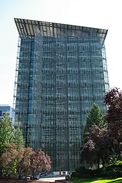 The building started a $133 million overhaul to improve efficiency and make the building more environmentally friendly in 2009.[17] SERA Architects was the architect for the improvements with Cutler Anderson Architects as the Design Excellence consulting architect, which included a new exterior to the structure.[17] PLACE studio was the landscape architect. Funding for the project came from the American Recovery and Reinvestment Act of 2009.[17] Seattle based Howard S. Wright Companies was the construction manager with the project designed to achieve a LEED Platinum rating.[18][19] The building re-opened in May 2013 after the $139 million remodel with an entirely new look that included a large solar panel on a tilted roof.[20] The Building was named by the American institute of Architects' Committee on the Environment as one of the top 10 sustainable projects of 2015.