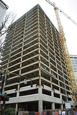 The Green – Wyatt building was constructed in the 1970s by Hoffman Construction Company under a $20 million contract.[1] The new building opened in 1975.[2] On June 21, 1989, an arson fire in the lobby caused $300,000 in damages, mostly from the sprinkler system that kept the night-time fire contained to the lobby area.[3] Firefighters returned in February of the next year when a person trapped in an elevator inadvertently set off the fire alarm.[4] Also that year, the U.S. and Foreign Commercial Service moved out of the building and into Oregon's World Trade Center.[5]