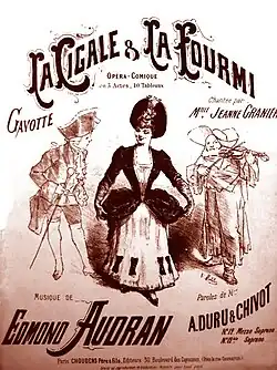 Audran's music met with as much favour in England as in France, and all but a few of his works were given in English adaptations in London theatres. The most successful of Audran's many comic operas were: Le grand mogol (Marseille, 1877; Paris, 1884; London, as The Grand Mogul, 1884 with a libretto by Farnie, starring Florence St. John, Fred Leslie and Arthur Roberts;[11] New York as The Snake Charmer, 1881);[12] La mascotte (Paris, 1880; New York, 1881;[13] London, as The Mascotte, 1881 with a libretto by Farnie, and cast including Lionel Brough and Henry Bracy);[14] Gillette de Narbonne (Paris, 1882; London, as Gillette, 1883, libretto by H. Savile Clarke, with additional music by Walter Slaughter and Hamilton Clarke);[15] La cigale et la fourmi (the grasshopper and the ant) (Paris, 1886; London, as La Cigale, 1890; English version by F. C. Burnand, starring Geraldine Ulmar, Eric Lewis and Brough);[16] Miss Helyett (Paris, 1890; London, as Miss Decima, 1891, libretto by Burnand);[17] and La poupée (Paris, 1896; London, 1897, libretto by Arthur Sturgess, starring Courtice Pounds and Willie Edouin).[18]