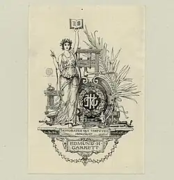 Edmund H. Garrett's bookplate, which he designed. A woman resembling a Muse is surrounded by printing tools. The motto reads "Honoratus Qui Virtutem Honorat"