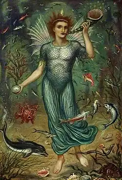 One of Prynne's most striking and original works is his altar piece, 'Benedicite Domino Laudate Et Superexaltate Eum in Saecula', which includes five painted panels illustrating separate lines from the canticle of creation. Here Prynne's mythological and religious worlds combine, notably in the panel depicting a sub-marine angel garbed in scales and delicate fish fin wings.[9] The piece was shown in the Royal Society of British Artists 114th Exhibition in 1896; a reviewer commenting, 'Mr. E. A. Fellowes Prynne shows an altar-piece, "Benedicite," rich in colour and the artist's mannerisms'.[10] Other artists highlighted for praise by the otherwise unimpressed reviewer included W. Graham Robertson, William Luker, and Tom Robertson.[10]