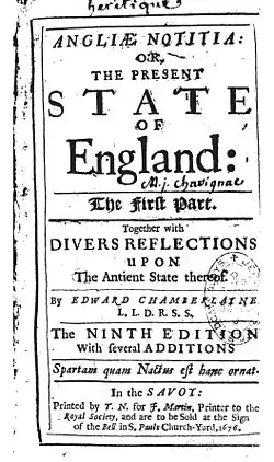 2. ^ Edward Chamberlayne (1676), Angliæ Notitia: Or, The Present State of England: the First Part. Together with Divers Reflections upon the Antient State thereof. By Edward Chamberlayne L.L.D. R.S.S. The Ninth Edition with Several Additions (9th ed.), [London], in the Savoy: Printed by T. N. for J. Martin, printer to the Royal Society, and are to be sold at the sign of the Bell in S. Pauls Church-Yard, p. 211, OCLC 12131668.