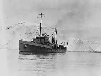 In June 1940, Smith was assigned as commanding officer of USCGC Northland while assuming duties as commander of the Greenland Patrol, which was responsible for Ice Patrol duties as well as assisting the Army and the Navy with establishing bases for the military defense of Greenland.[1] Although the Commandant of the Coast Guard, Admiral Russell R. Waesche, wanted to discontinue the Ice Patrol activities for the 1941 season, it was suggested by President Franklin D. Roosevelt that the Ice Patrol might be a good cover for investigating reports that the German Navy might be attempting to establish weather stations along Greenland's eastern coast.[16] As part of an agreement with the government of Denmark, Smith organized the Danish and Eskimo manned Northeast Greenland Sledge Patrol to patrol the eastern shores of Greenland in an effort to detect German weather stations.[17] Smith was named as Commander, Northeast Greenland Patrol which consisted of USCGC Bear and USCGC North Star as well as Northland.[1][4] In early September 1941, the Sledge Patrol reported the position of a vessel that had landed men in Greenland. Northland made contact with the Norwegian sealer Buskoe and put a prize crew aboard. A shore party from Northland located an unauthorized radio station manned by a shore party of four from Buskoe. Buskoe was towed to Boston by Bear and the crew of Buskoe were charged as illegal immigrants and not as prisoners of war because the United States was not at war at the time.[16][18]