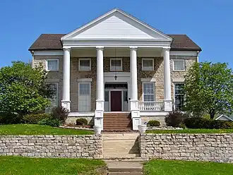 Greek Revival was the first style of architecture to have an impact in Davenport. The side gabled house features a large porch across the front. It is capped by a triangular pediment that is held up by Doric columns. The long rectangular windows on the first floor are decorated with simple, molded cornices. A simple cornice is also found at the roofline. One source says that Barrow's could not find a local craftsman to create the columns for the porch so he did it himself.[3] Another source says they were created in the south and they were shipped to Davenport via steamboat and brought to this location by teams of horses.[4] The native stone was taken from a nearby riverbank.