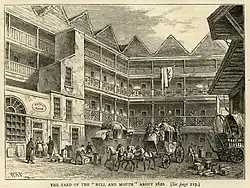 The Bull & Mouth Inn c. 1820 by W.H. Prior from Old and New London, Illustrated, Vol. 2, 1878, by Walter Thornbury.