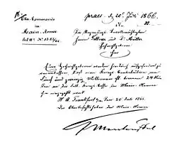 Manteuffel's signature on a document from 20 July 1866: Frankfurt has to pay 25 million gulden war contribution within 24 hours.