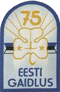 The Girl Guide emblem is set upon a banner of the flag of Estonia.