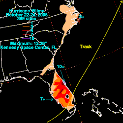 Wilma's rapid movement across Florida generally limited precipitation to between 3 and 7 in (76 and 178 mm), while some locations reported 1 to 2 in (25 to 51 mm) of rainfall or less.[1] However, the Kennedy Space Center observed 13.26 in (337 mm) of precipitation.[8] Much of southern Florida experienced hurricane-force winds, with Category 2 conditions likely occurring in Broward, northern Miami-Dade, and Palm Beach counties. The highest surface-height sustained wind speed in Florida was a 15-minute average of 92 mph (148 km/h) at an observation site located in Lake Okeechobee, corresponding to a 1-minute average of 104 mph (167 km/h). Much of the Florida Keys experienced 4 to 5 ft (1.2 to 1.5 m) storm surge, with estimates of nearly 9 ft (2.7 m) in the vicinity of Marathon. On the mainland, the highest recorded storm surge values occurred in Collier County, reaching 4 to 8 ft (1.2 to 2.4 m) in height. Wilma spawned ten tornadoes in Florida, with four in Brevard County and one each in Collier, Hardee, Highlands, Indian River, Okeechobee, and Polk counties.[1]