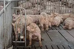 Livestock is fed either by letting them directly graze forage from pasture, or by growing crops like corn or soybeans for fodder. Both are highly important; the majority of soybeans are grown for fodder, while a third of croplands worldwide are devoted to forage, which feeds around 1.5 billion cattle, 0.21 billion buffalo, 1.2 billion sheep and 1.02 billion goats.[23] Insufficient supply or quality of either leads to a decrease in growth and reproductive efficiency in domestic animals, especially in conjunction with the other stressors, and at worst, may increase mortality due to starvation.[24] This is a particularly acute issue when livestock herds are already of an unsustainable size. For instance, two-thirds of animal feed requirements in Iran come from its rangelands, which cover around 52% of its land area, yet only 10% have forage quality above "medium" or "poor". Consequently, Iranian rangelands support over twice their sustainable capacity, and this leads to mass mortality in poor years, such as when around 800,000 goats and sheep in Iran perished due to the severe 1999 − 2001 drought. This was then exceeded by millions of animal deaths during the 2007–2008 drought.[25]
