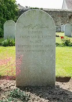 After the October mutiny the British were less severe in their response and afterwards disaffected companies were moved to rest camps.[10] Contracts for ELC labourers were standardised on 1 November 1917 at a fixed six months.[6] As ELC troops were withdrawn from France the camp at Marseilles was closed on 23 February 1918.[10] Consideration was given to raising two new ELC companies for service in Marseilles in June 1918 but issues finding volunteers in Egypt prevented this from proceeding.[10] The "voluntary" enlistment system was replaced from July 1918 by the reintroduction of the corvée system of conscription for labour, an Ottoman-era system phased out by 1889. This reduced complaints about unfair selection of men for service in the ELC by village headmen.[14][15] Resentment among former members of the ELC was one cause of the Egyptian revolution in March 1919.[16]