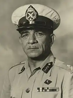 The modern Egyptian army was established as a result of the 1936 Anglo-Egyptian treaty, which allowed the Egyptian army to expand from 398 officers to 982.[75] Nasser applied at the Obassia Military College, Egypt's leading cadet school, in 1937. Anwar Sadat graduated from the Egyptian Military Academy in 1938.[76] Sadat had been trying to form an anti-British uprising since the 1940s, but was arrested after meeting with two Nazi spies in 1942.[77] The humiliating 1942 British coup and the disaster in Palestine motivated the creation of a secret cell of revolutionary Egyptian officers. After the witnessing the 1949 Syrian coup, when Syrian military overthrew the government, whispers of a revolt spread throughout the corps. While an exact date is not known, by 1949 meetings and discussions in the homes of the officers started the beginning of the 'Free Officers' movement. While officers met with communists in the Democratic Movement for National Liberation (DMNL) and Islamists in the Muslim Brotherhood, it was an organization independent of the pre-existing opposition.[78] Members took a vow of secrecy with one hand on the Koran and the other on a revolver, and published anonymous leaflets and articles criticizing the higher command and the government as a whole for corruption.[79][80] By 1952, it grew so large that few members knew the identities of the leaders of the conspiracy: Colonel Nasser and General Naguib.[81]
