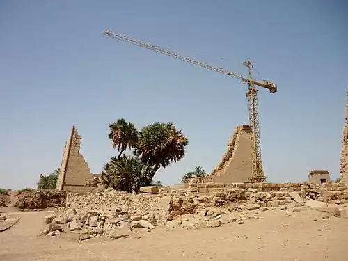 Temple structures were built on foundations of stone slabs set into sand-filled trenches.[92] In most periods, walls and other structures were built with large blocks of varying shape.[93][Note 5] The blocks were laid in courses, usually without mortar. Each stone was dressed to fit with its neighbors, producing cuboid blocks whose uneven shapes interlocked.[95] The interiors of walls were often built with less care, using rougher, poorer-quality stones.[96] To build structures above ground level, the workers used construction ramps built of varying materials such as mud, brick, or rough stone.[97] When cutting chambers in living rock, workers excavated from the top down, carving a crawlspace near the ceiling and cutting down to the floor.[98] Once the temple structure was complete, the rough faces of the stones were dressed to create a smooth surface. In decorating these surfaces, reliefs were carved into the stone or, if the stone was of too poor quality to carve, a layer of plaster that covered the stone surface.[99] Reliefs were then decorated with gilding, inlay, or paint.[100] The paints were usually mixtures of mineral pigments with some kind of adhesive, possibly natural gum.[99]