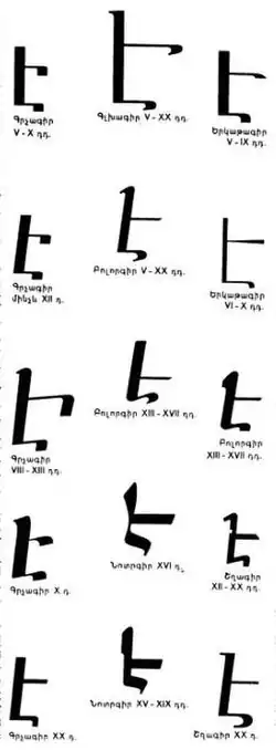 E, Ē, or Eh (majuscule: Է; minuscule: է; Armenian: է) is the seventh letter of the Armenian alphabet. It represents the open-mid front unrounded vowel (/ɛ/) in Eastern Armenian and the close-mid front unrounded vowel (/e/) Western Armenian. This letter is related the Armenian letter Yečʼ (Ե). After the 20th century spelling reform, the letter is used to write a word initial /ɛ/[1], while word initial ječʼ (ե) is pronounced /jɛ/. Before the orthography reform, the two letters were used interchangeably. Created by Mesrop Mashtots in the 5th century, it has a numerical value of 7.[1]