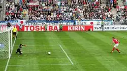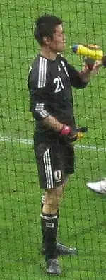 In May 2010, Kawashima was selected for the World Cup squad and was expected to serve as backup to Seigo Narazaki.[141] In a friendly match on 30 May against England, he was the starting goalkeeper and produced many saves. He denied Frank Lampard twice, including a penalty kick, and a shot by Wayne Rooney before eventually being beaten by two own goals.[142] Afterwards, it was announced that Kawashima was selected to be the first choice goalkeeper for the FIFA World Cup ahead of Narazaki.[143] He played his first Group E match against Cameroon on 14 June 2010, where Japan recorded its first World Cup win on foreign soil with a score of 1–0.[144] Five days later, on 19 June 2010 between against the Netherlands, Kawashima was the starter; he deflected a shot from Wesley Sneijder but it went in his own net as the team lost 0–1.[145] In the match against Denmark on 24 June he allowed one goal through Jon Dahl Tomasson's penalty kick, but the team still won 3–1 and advanced to the round of 16.[146] On 29 June, he allowed no goals against Paraguay but was unable to save a single spot-kick during the penalty shoot-out, which Paraguay won 5–3.[147]