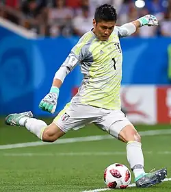 Kawashima about to take a goal kick during the match against Belgium in the round of 16 of the 2018 FIFA World Cup in Russia