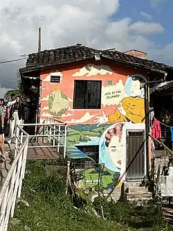The entrance to La Plazoleta features a mural of La Piedra floating and a spaceman with the words, "¡Nos están dejando!". Locals once believed that the rock came from aliens.
