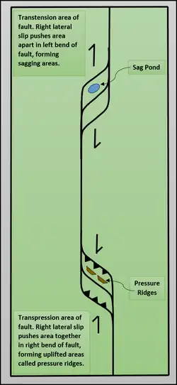 Transtension and transpression of a right lateral fault. Combined data from illustrations and text.[2][7]