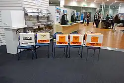 After their name is marked off, the voter is issued a voting paper. The voter then goes behind a cardboard screen, where they mark their paper using a supplied orange ink pen. The voter then folds their paper and places in their electorate's sealed ballot box. Voters who enrol after the rolls have been printed, voting outside their electorate, or on the unpublished roll casts a special vote which is separated for later counting.[42]