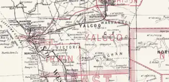 In 1898, the district was based around the Mullewa–Meekatharra railway, including the towns of Mullewa, Pindar, and Yalgoo, as well as outlying farms and pastoral leases like Gabyon Station.[1]