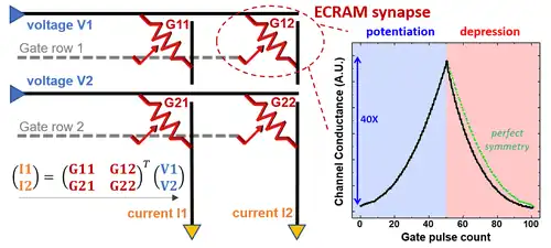 Electrochemical Random-Access Memory (ECRAM) is a type of non-volatile memory (NVM) with multiple levels per cell (MLC) designed for deep learning analog acceleration.[1][2][3] An ECRAM cell is a three-terminal device composed of a conductive channel, an insulating electrolyte, an ionic reservoir, and metal contacts. The resistance of the channel is modulated by ionic exchange at the interface between the channel and the electrolyte upon application of an electric field. The charge-transfer process allows both for state retention in the absence of applied power, and for programming of multiple distinct levels, both differentiating ECRAM operation from that of a field-effect transistor (FET). The write operation is deterministic and can result in symmetrical potentiation and depression, making ECRAM arrays attractive for acting as artificial synaptic weights in physical implementations of artificial neural networks (ANN). The technological challenges include open circuit potential (OCP) and semiconductor foundry compatibility associated with energy materials. Universities, government laboratories, and corporate research teams have contributed to the development of ECRAM for analog computing. Notably, Sandia National Laboratories designed a lithium-based cell inspired by solid-state battery materials,[4] Stanford University built an organic proton-based cell,[5] and International Business Machines (IBM) demonstrated in-memory selector-free parallel programming for a logistic regression task in an array of metal-oxide ECRAM designed for insertion in the back end of line (BEOL).[6] In 2022, researchers at Massachusetts Institute of Technology built an inorganic, CMOS-compatible protonic technology that achieved near-ideal modulation characteristics using nanosecond fast pulses.[7]