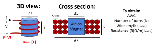 The first and most important step is to design the solenoid that will create the magnetic field to reverse the magnetization of the AlNiCo. As mentioned before the AlNiCo has an intrinsic coercivity of 50kA/m so it is necessary to create a field of at least: . It is recommended to design the field 3 times higher than the intrinsic coercivity to fully magnetize a material. Picture below depicts the coil design parameters: