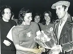 Schiavo (left), captain of the women's national team, being given an award by Adriano Celentano in 1974