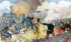 During the War of the Pacific, Ramírez had obtained the rank of lieutenant colonel and commanded the 2nd Infantry Regiment "Maipo", who numbered 1,117,[2] at the Battle of Tarapacá.[3] In accordance to Ricardo Santa Cruz Vargas and Luis Arteaga's plan, he led a detachment of his regiment that numbered 880 to engage the forces of Col. Miguel Rios and Francisco Bolognesi in the Quebrada de Tarapacá. He doubted the plan, saying, "They are sending me into a slaughterhouse." Battle commenced when the Allies fired at the exposed Chileans from Tarapacá. Ramírez sent two companies to flank while he led an attack into the town. The street fight went into the main plaza and both sides took considerable losses. Due to his men's exhaustion, Ramírez ordered the entire force retreat to Guarasiña, near the entrance of the gorge. The force was half in number and used most of its ammunition. Santa Cruz's force also experience defeat, and once the battlefield was the calm, the Chileans fed their horses and searched for food and water. The Allies, reinforced by Justo Pastor Dávila and Alejandro Herrera arriving from Pachica, attacked. Some Chileans only had bayonets and entrenching tools for weapons. By 3:30 p.m., Ramírez was wounded twice and with only his revolver, mustered a third bayonet charge from his men. He was wounded again and died laying on the side of a house; by the time relief sent by Manuel Baquedano got there, 45% of Ramírez's line were casualties. His body was recovered months later.[4] His death was glorified and a dramatized account by correspondent Eloy Caviedes, who got his information from testimonies, published in El Mercurio on 15 December claimed that in Ramírez's final moments he fired his revolver's last rounds. This process intended to create a narrative of brave Chilean devotion.[3] In order to incentivize his soldiers to kill every enemy, prior to the commencement of the Battle of Tacna, Estanislao del Canto claimed Ramírez and his cantineras were burned alive by Peruvians.[5]