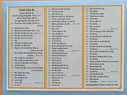 Great Compassion Mantra (Chinese: 大悲咒, Dàbēi zhòu; Vietnamese: Chú Đại Bi). In Chinese-speaking countries and in Vietnam, this text is as popular as the Eleven-Faced Avalokiteśvara Heart dhāraṇī Sutra, with which it is often confused. This confusion probably stems from the fact that the two dhāraṇī are often incorrectly referred to by the same title: Great Compassion Mantra. The text presented above is the Vietnamese version, a transliteration of the Chinese one. We note that it consists of 84 verses, whereas the Eleven-Faced Avalokiteśvara Heart dhāraṇī has only 21, 24 or 26 verses depending on the version.