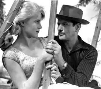Wallach's film debut was in Elia Kazan's controversial 1956 Baby Doll, for which he won the British Academy Film Awards (BAFTA) as "Most Promising Newcomer."[28] Baby Doll was controversial because of its underlying sexual theme. Director Elia Kazan however, set explicit limits on Wallach's scenes, telling him not to actually seduce Carroll Baker, but instead to create an unfulfilled erotic tension.[29] Kazan later explained his reasoning: