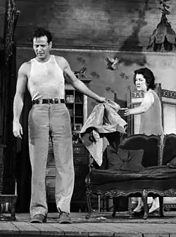 In 1945 Wallach made his Broadway debut and he won a Tony Award in 1951 for his performance alongside Maureen Stapleton in the Tennessee Williams play The Rose Tattoo.[22] His other theater credits include Mister Roberts, The Teahouse of the August Moon, Camino Real, Major Barbara (in which director Charles Laughton discouraged Wallach's established method acting style),[22] Luv, and Staircase, co-starring Milo O'Shea, which was a serious depiction of an aging homosexual couple. He also played a role in a tour of Antony and Cleopatra, produced by the actress Katharine Cornell in 1946.[23] He exposed Americans to the work of playwright Eugène Ionesco in plays including The Chairs and The Lesson in 1958, and in 1961 Rhinoceros opposite Zero Mostel.[22] He last starred on stage as the title character in Visiting Mr. Green.[24]