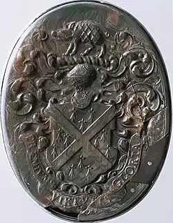 Other paintings included those of philosopher Thomas Hobbes, astronomer Pierre Gassendi, Sir John Wynn, and Jacques Courtois, previously patroned by Mattias de' Medici.[197][198] At Yale's death, his collection launched the auction concept in Britain, spacing the sales at a few months' intervals to not overload the art market.[190][182][183][184] His European paintings were the largest group ever sold in England.[199] Catalogues were available at various coffee houses such as Garraways.[199] Van der Werff's painting was acquired by the Earl of Derby, while a bidding war ensued for Queen Mary's ring between the Earl of Oxford and the Earl of Pembroke.[159] Yale's granddaughter married the latter's son, Nicholas Herbert, who lived at Wilton House and Highclere Castle.[190] Inigo Jones's designs were acquired by the 2nd Duke of Devonshire, and are still at Chatsworth House.[200] It is thought that some of Yale's missing paintings are now at the Hermitage Museum in Russia, dating back from Catherine the Great's acquisition of the Walpole collection at Houghton Hall.[201][202] Numerous works would later be acquired by Yale University, while others went to Madryn Castle, seat of Deputy William Corbet Yale of the Yales of Plas yn Yale.[203]
