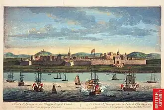 In July 1687, Yale was appointed President of Madras and Governor of Fort St. George, replacing William Gyfford.[35][36] A difficulty of the office was to deal with the native rulers through firmans, as Madras was surrounded by the Mughal Empire, with rulers always asking for bribes.[37] When their demands were refused, they would seize the food supplies, half starving the company's servants with a blockade.[37] In terms of size, Madras consisted of about 300,000 people, or around 6% of England's population at the time.[38] Yale had previously been popular with both the Europeans and native Indians,[39] and reverted to the former practice of living and dining in the Fort House with merchants, writers and factors.[39]